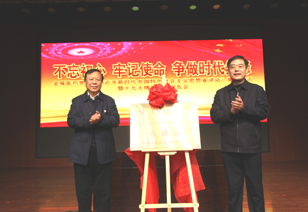 所在位置:首頁 - 新聞中心 11月29日,金城醫(yī)藥黨委“習近平新時代中國特色社會主義思想宣講站”揭牌儀式暨十九大精神宣講報告會在金城醫(yī)藥會堂舉行。淄川區(qū)委常委、宣傳部長白向坊,金城醫(yī)藥黨委書記趙鴻富出席活動并為宣講站成立揭牌。