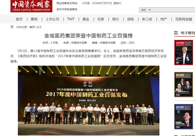 7月3日,第13屆中國制藥工業(yè)百強(qiáng)年會在云南昆明隆重舉行。會上,由國家食藥監(jiān)總局南方醫(yī)藥經(jīng)濟(jì)研究所、《醫(yī)藥經(jīng)濟(jì)報(bào)》組織評選的“2017年度中國制藥工業(yè)百強(qiáng)榜”正式發(fā)布,金城醫(yī)藥集團(tuán)榮登中國制藥工業(yè)百強(qiáng)榜。