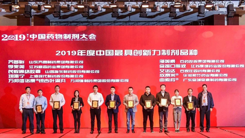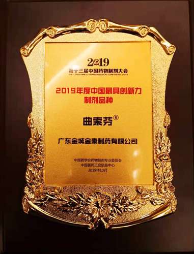10月11日,2019年第十三屆中國藥物制劑大會在山東煙臺召開,大會由中國藥學會主辦,中國藥學會藥劑專業委員會、國際控釋協會中國分會、中國醫藥工業信息中心、中國科學院上海藥物研究所煙臺分所、山東省藥學會等單位承辦。大會同時發布了2019年度中國最具成長力科技創新型醫藥企業、2019年度中國最具創新力制劑品種兩大榜單。金城醫藥旗下企業廣東金城金素制藥有限公司生產的曲索芬®產品榮登“2019年度中國最具創新力制劑品種”榜單。