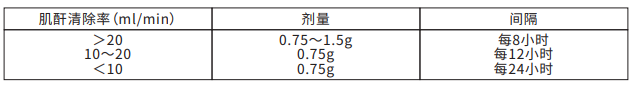 對于接受透析的患者,在每次透析結束時再給予本品750mg。對于連續腹膜透析,適宜的劑量為每日兩次,每次750mg。在監護室進行連續動靜脈血液透析或高流量血透的腎功能衰竭的患者,適宜劑量為每日兩次,每次750mg。對于低流量血透患者,用藥劑量參見“腎功能損害時的劑量”。