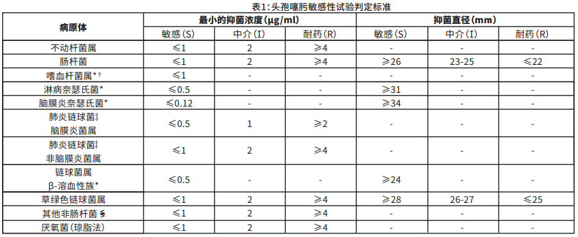對于厭氧菌,頭孢噻肟藥敏試驗最小抑菌濃度(MICs)可通過標準瓊脂擴散法檢測。獲得的最小抑菌數值應該按表1中的標準進行判定。