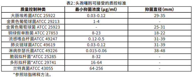 標準化藥敏試驗過程要求利用實驗室監控并確保測定過程中供試品和分析試劑的準確度和精密度,以及個人操作實驗的技術水平。應提供具有表2中MIC值的頭孢噻肟粉末標準品。對于使用擴散法的30μg的頭孢噻肟紙片的抑菌直徑標準應該符合表2的數值。
