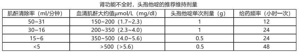 在腎功能損害情況下的劑量:頭孢他啶幾乎全部通過腎小球濾過而從腎臟排泄.因此,對患有腎功能損害的病人,應降低劑量以代償其減慢的排泄功能,腎功能輕度損害(即腎小球濾過率(GFR)大于50ml/分)的患者除外.對于懷疑為腎功能