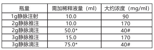 給藥方法:頭孢他啶可靜脈給藥或深部肌肉注射給藥,如臀大肌之上夕HM四分之一或大腿的外側部位.調制指導:需加稀釋液量及溶液濃度見下表,需要采用部分劑量時,該表可能有用.