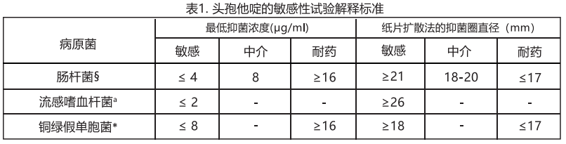 腸桿菌的敏感性解釋標準是基于每8小時1g劑量而得出.對于中介敏感的分離菌株,腎功能正?;颊呙?小時給藥劑量2g. *銅綠假單胞菌敏感性解釋標準是基于腎功能正常的患者每8小時靜注2g劑量而得出的.目前不存在除"敏感"類別以外 的耐藥菌株信息,不能定義除"敏感"外的類別.如果測出除敏感之外的MIC結果,則應將其提交至參考實驗室進行附加試驗.葡萄球菌對頭抱他。定的敏感性可能從僅對青霉素和頭抱西丁或苯理西林的測試中推導出來的。藥敏報告"敏感"表示,抗菌藥 物在感染部位通常達到的濃度很可能會抑制病原菌生長.報告"中介"表示,該結果是不明確的,如果微生物對可替換的臨床可行藥物不完全敏感,則應重復進行該測試.這個分類意味著在藥物生理性聚集的身體部位或在能使用高劑量的情況下可能具有臨 床適用性.這個分類還能提供一個緩沖區間來防止小的、不受控制的技術因素導致的解釋差異.報告"耐藥"表示抗菌藥物在感染部位通常達到的濃度很可能不能抑制病原菌的生長,應該采取其他的治療方法.