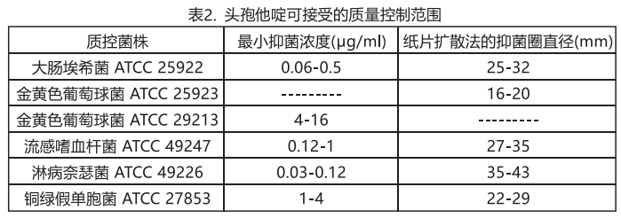 質量控制標準化藥敏試驗方法需采用實驗室對照品,以便監測和確保藥敏試驗中所用樣品和試劑以及試驗操作人員技術的準確度和精確度.頭袍他碇標準粉末應提供表2中的MIC值范圍.對于使用30Pg頭孢他啶紙片進行的擴散法應符合表2中的標準.